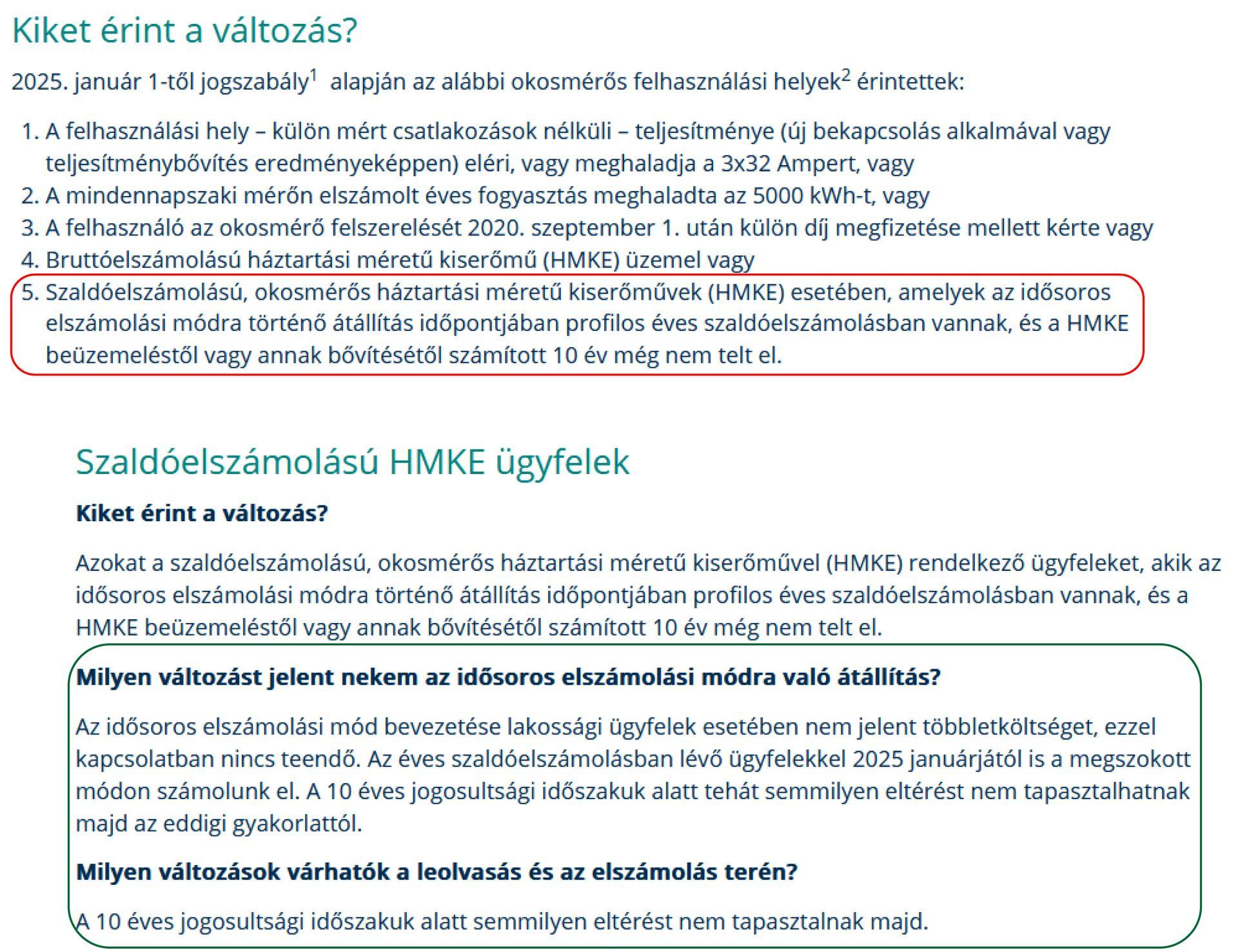 - szaldó elszámolású, okosmérős háztartási méretű kiserőművek (HMKE) esetében, amelyek az idősoros elszámolási módra történő átállítás időpontjában profilos éves szaldóelszámolásban vannak, és a HMKE beüzemeléstől vagy annak bővítésétől számított 10 év még nem telt el.