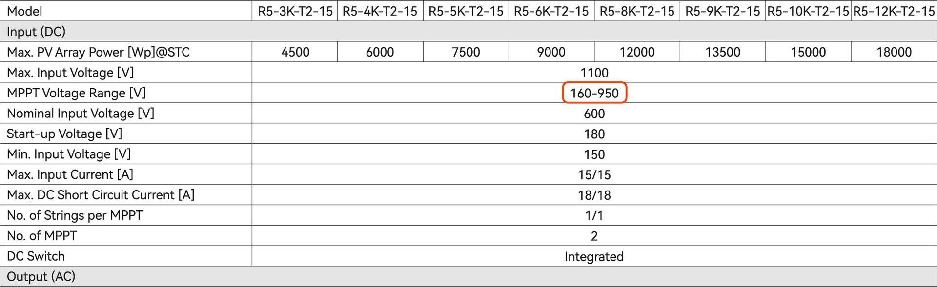 Az MPPT tartomány ezeknél az invertereknél 160V és 950V között van. Kisebb feszültség esetén nem indul el az inverter, nagyobb feszültségnél a szervizesek szerint "elpukkan" magyarán tönkremegy. Egyik eset sem jó!