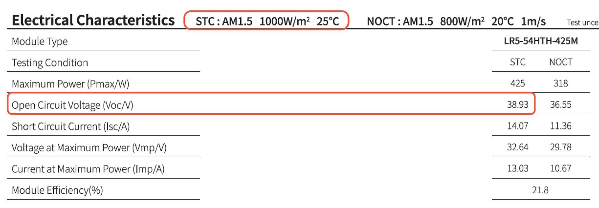 Az OC az Open Circuit rövidítése, a napelem kábelein ekkora feszültség mérhető nyitott áramköri állapotban. Az STC a Standard Test Conditions rövidítése, 1000W/m2 besugárzás, 25 oC környezeti hőmérséklet és 1,5-es légköri szennyezettség esetén.