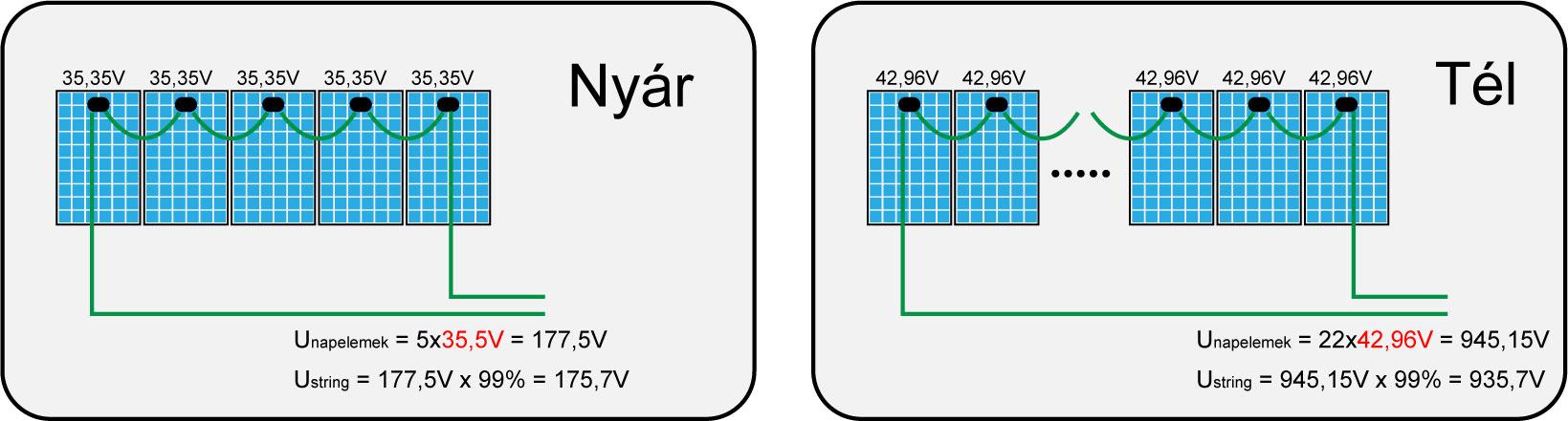A 160V induló feszültség a nyári helyzetben meghatározza a minimális napelem darabszámot, ami a fenti példa alapján 5db. A 950 V-os max. feszültség a téli darabszám esetén fontos, vagyis 22db.