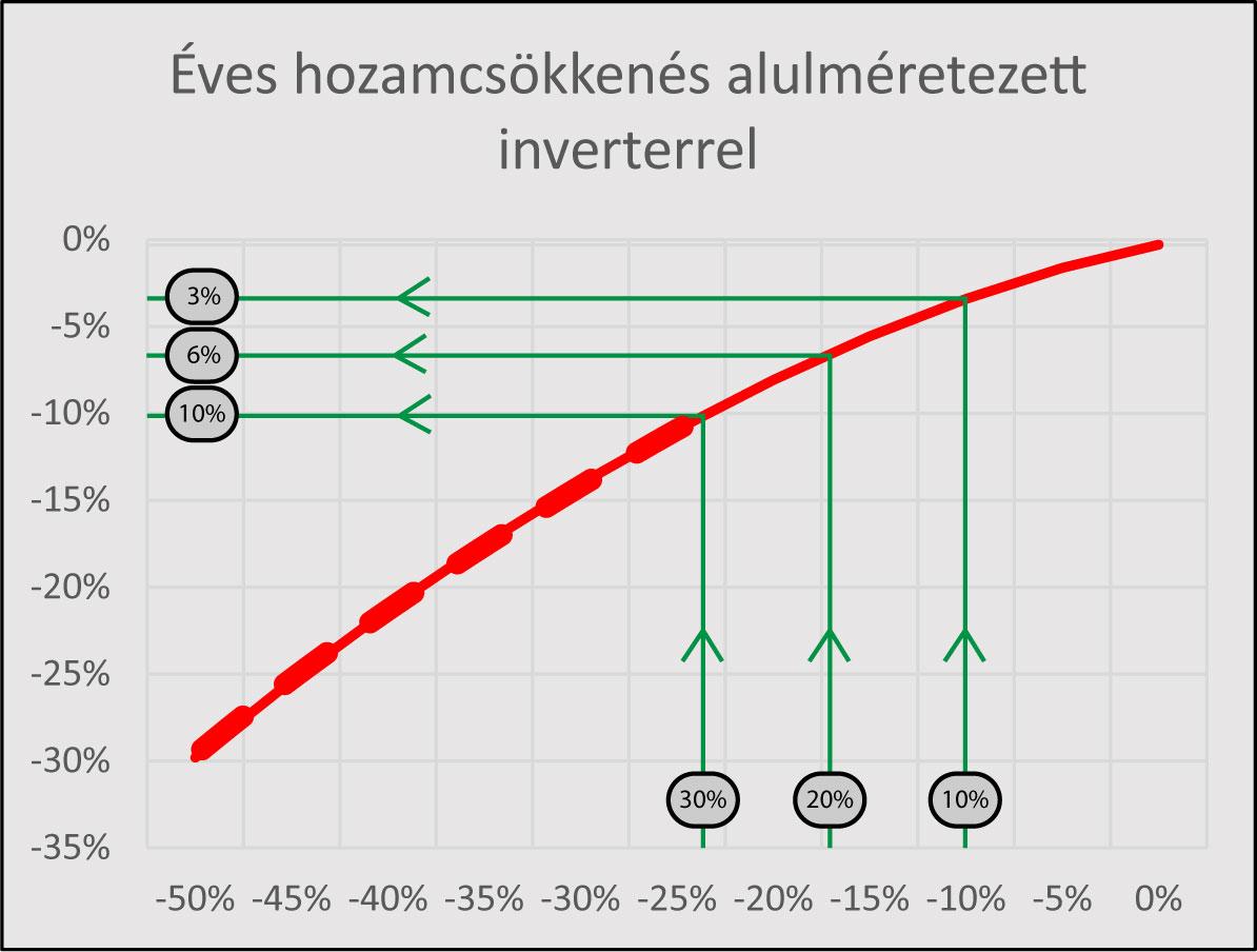 Ezen információk alapján javasoltuk korábban a max. 30%-os túlméretezést. Az invertergyártók 50%-ot mondanak -a magyar elszámolás ismerete nélkül. Manapság olyat is olvashatunk a hibrid inverterek katalógusaiban, hogy akár 100%-al is túllőhetjük a rendszert.