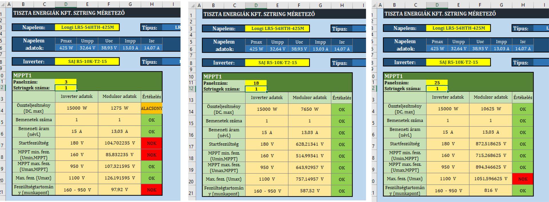 Persze érdemes inkább számítógépes programot használni, ahol be kell állítani a tervezett invertert és a tervezett napelem db számot és ha minden OK, akkor rendben, ha csak egy NOK, akkor nem jó a terv, módosítani kell.